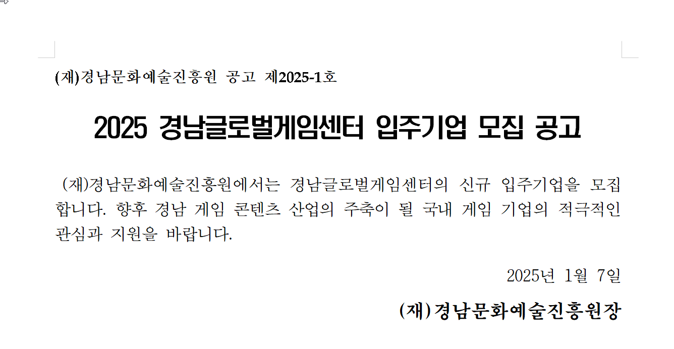 2025년 2월, 경남글로벌게임센터에서 입주기업 공고를 올렸습니다.